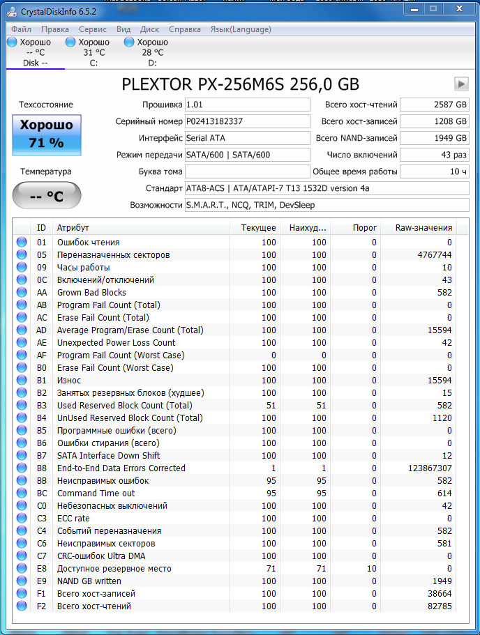 Камрады, принесли Plextor M6S на 256 Гигов. Диск раз через раз позволяет запустить систему, в системе определяется с трудом, попытки с 10 удалось снять смарт.