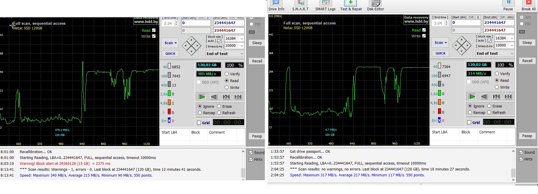 Я, как говорится, просто оставлю это здесь. На скриншоте SSD Netac 500S на контроллере marvell nv1120 и 72 слойной памяти hynix 3dTLC. Слева скрин чтения после нескольких месяцев в выключенном состоянии. Справа - через сутки простоя компьютера. То есть по факту после одного посекторного чтения всего объема и 24-х часов простоя.