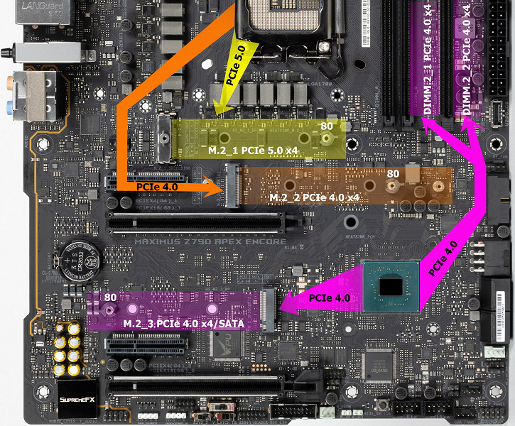 Подскажите по правильному расположению накопителей на плате Плата z790 Apex Encore.