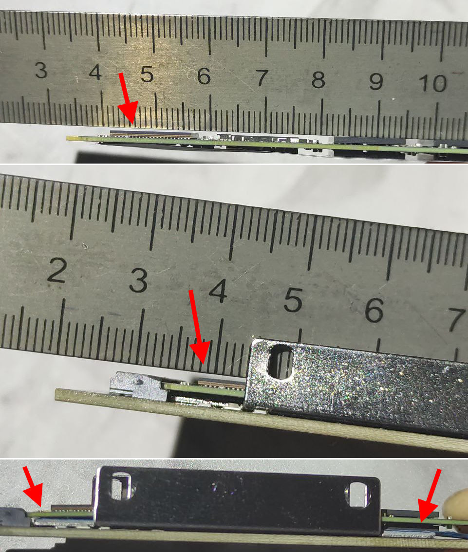Рекомендую нарезать термопрокладку лезвием по линейке, желательно металлической, подложив толстый слой твёрдого картона и, желательно, за один прорез. Берегите руки. На современных материнских используются высокие разъёмы m.2, что позволяет свободно разместить нижнюю пластину радиатора без изгибов. На известных мне переходниках используются низкие разъёмы. Это приводит к тому, что микросхемы с нижней стороны SSD ложатся прямо на поверхность переходника вообще без зазора. По итогу очумелоручивания было решено убрать нижнюю пластину и отводить тепло через термопрокладку прямо на плату переходника, так-как у него есть набор сквозных металлизированных отверстий с пятаками для отвода тепла. Также здесь не нужно ложить термопрокладку под обратную сторону контроллера, так-как изгиб смещается в сторону контроллера, что ведёт к сильному локальному перекосу и может привести к его отрыву... На сам контроллер и на микросхемы DRAM буфера с обоих сторон было уложено по 2 слоя термопрокладки. Итого получаем один слой 0.5 мм на четыре микросхемы памяти, по два слоя на две микросхемы памяти и контролер. Прокладки 50*95 мм хватает на две стороны SSD с минимальным запасом. Вполне рационально будет вырезать кусочки термопрокладки под размер микросхем. При этом можно будет сэкономленное в 3 или 4 слоя уложить на элементы питания рядом с контроллером и DRAM. В таком виде радиатор нормально прижался к SSD по всей поверхности. Под гайку фиксирующую SSD необходимо подобрать и подложить пластиковую шайбу, так как она остаётся висеть на расстоянии от платы переходника и винт не зажимается, что может привести к его откручиванию во время работы ПК. А при зажатии винта в такой ситуации происходит сильный изгиб платы. Радиатор был аккуратно примотан канцелярскими резинками к переходнику, стараясь минимально мешать воздушному потоку. На всё это дело теми же резинками был натянут трёхпиновый вентилятор 70*70*10 мм с максимальными оборотами 3100 в секунду. В последствии обороты были установлены на 2260 из-за шума.
