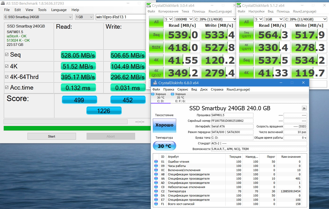 С оговоркой эксплуатации на штатном драйвере msahci (драйвер Intel [он же iaStorA, IRST] на контроллер SATA не ставить): - SmartBuy Ignition 2, GoodRAM C50/100, PQI S522, Corsair Force LS 240 Гбайт**, Patriot Blaze 240 Гбайт*** и прочие Phison-based (контроллер Phison; за полным списком лучше заглянуть в FAQ); Проблема заключается в падении скоростных характеристик на операциях записи. По отзывам, встречается при прошивке версии 7.7. Исправляется обновлением прошивки до версии 7.9 (после чего может потребоваться выполнение Secure Erase).
