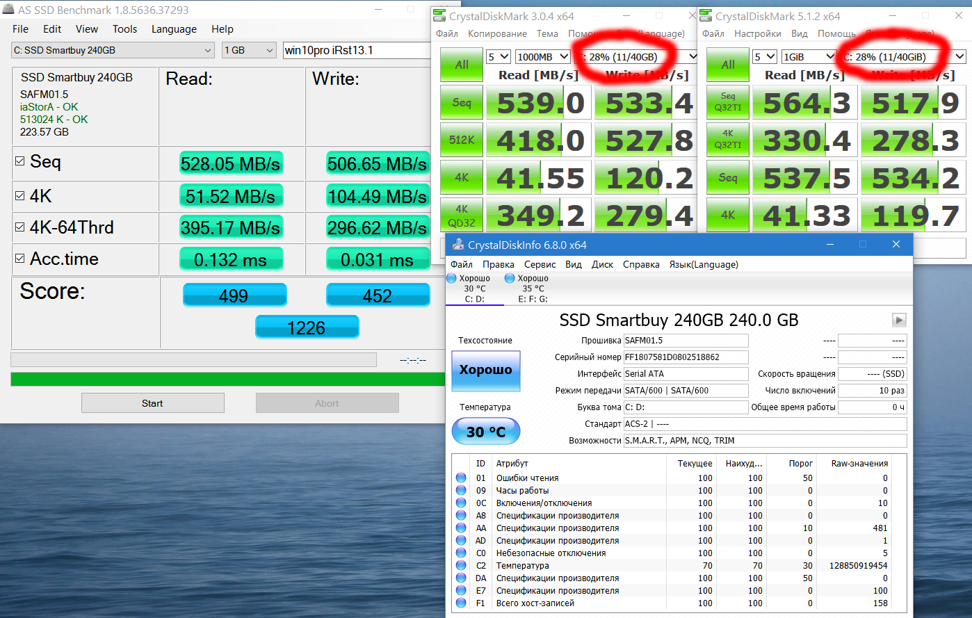PNC 1. Раздел С: на диске равен 40, win10pro64 занимает 11. Т.е. все тесты запускались из-под windows установленной на этом диске. 2. Это у TLC. 3. Ни в коем разе.