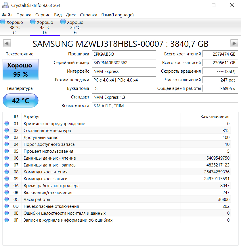 гарантийный ресурс 7PB(т.е. примерно треть у меня получается) за 5 лет, может из-за того что не так интенсивно использовался(это наработка за 4 года использования), поэтому я вообще не парюсь, даже если там ещё осталось ~4-5Tb, то при моём использовании внукам хватит.