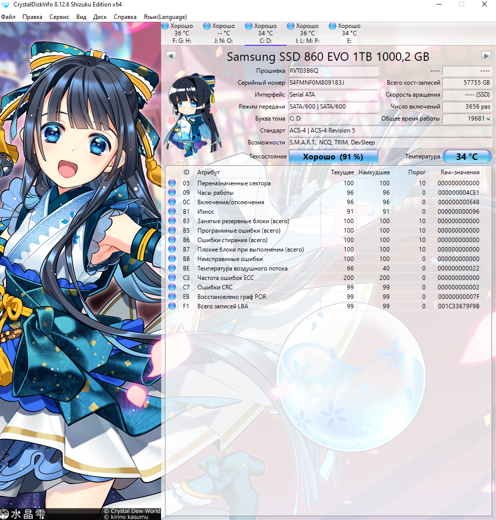 7. Для того что бы оценить состояние диска SSD воспользуйтесь прогнраммой Crystal Disk Info. Перед выкладыванием скриншотов Crystal Disk Info в меню Сервис>Дополнительно>Raw-значения выберите вариант "10 [DEC]" это несколько упростит восприятие информации.