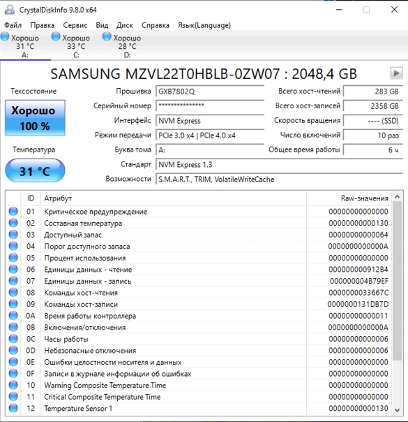 ========================================= Перед публикацией скриншотов Crystal Disk Info в меню "Сервис" >> "Дополнительно" >> "Raw-значения" выберите вариант "10 [DEC]". Это упростит восприятие информации. В меню "Сервис" ставьте галочку "Скрыть серийный номер".