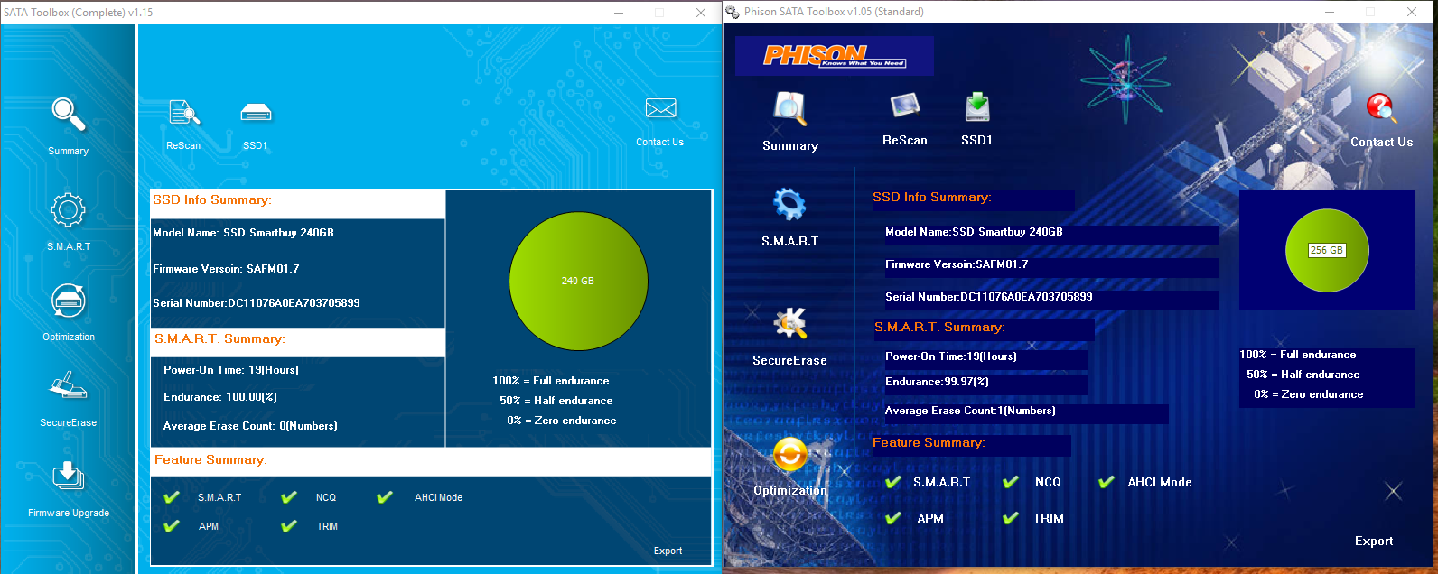 Список: - версия имеет обозначение вида "S8FM**.*" - PS3108-S8 + MLC NAND (ассортимент широк); - версия имеет обозначение вида "S9FM**.*" - PS3109-S9 + MLC NAND (ассортимент широк); - версия имеет обозначение вида "SAFM0*.*" или "SAFC0*.*" - PS3110-S10 + MLC NAND (19 nm Toshiba или 20 nm Micron/Intel); - версия имеет обозначение вида "SAFM1*.*" или "SAFC1*.*" - Phison PS3110-S10 + TLC NAND Toshiba (19 nm и 15 nm); - версия имеет обозначение вида "SAFZ1*.*" - Phison PS3110-S10 + 15 nm TLC NAND Toshiba; - версия имеет обозначение вида "5**ABBF*" или "6**ABBF*" - SandForce SF2281/SF2241 + MLC NAND (ассортимент широк); - версия имеет обозначение вида "20141516" - Silicon Motion SM2242XT + MLC NAND (ассортимент широк);