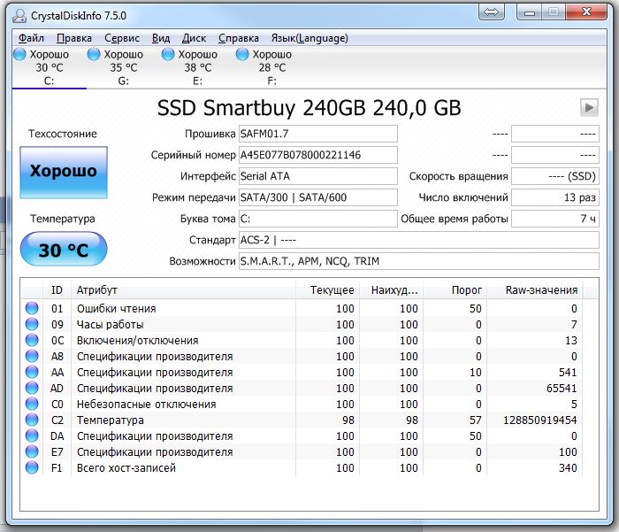 7. Для того что бы оценить состояние диска SSD воспользуйтесь прогнраммой Crystal Disk Info. Перед выкладыванием скриншотов Crystal Disk Info в меню Сервис>Дополнительно>Raw-значения выберите вариант "10 [DEC]" это несколько упростит восприятие информации.