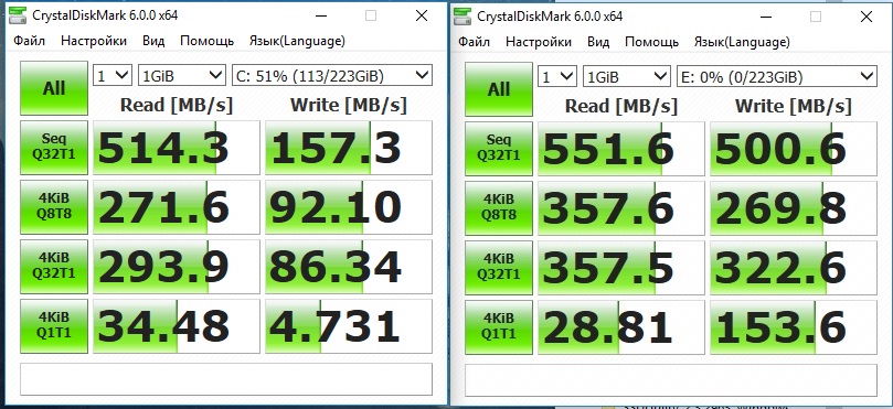 Для статистики скрин моих предыдущих Cosair XT 240 (2 года ему было,диск С) и Vertex 460 (диск Е, было 3 года ему) Корсар почему-то сильно просел
