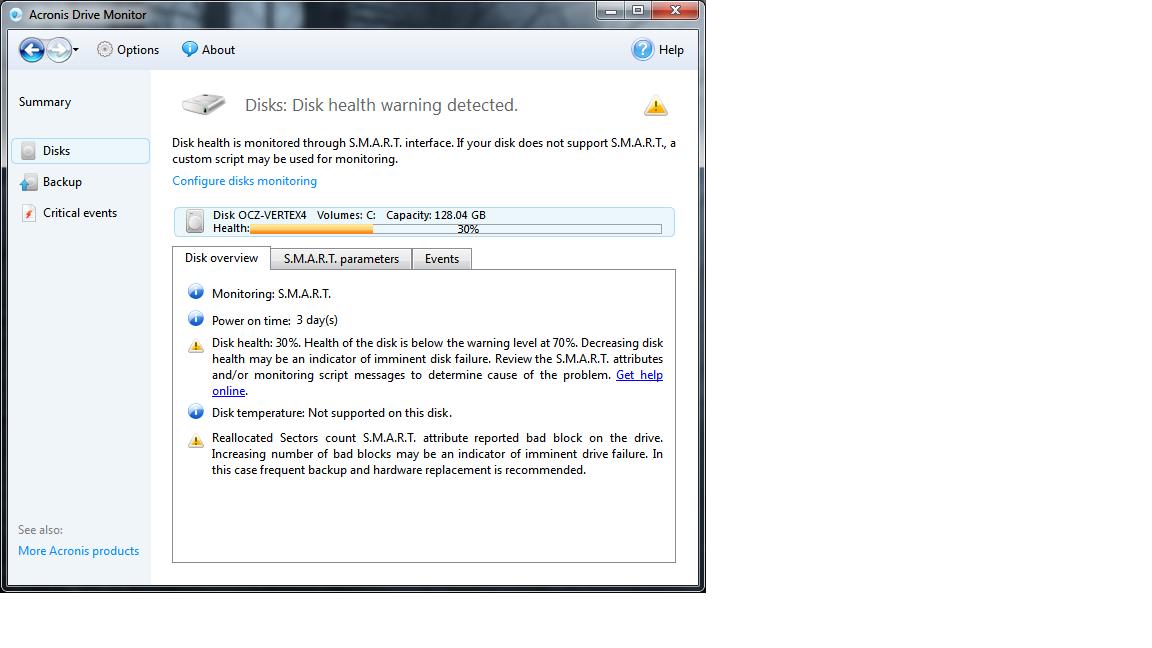 Доброго времени суток, купил новый ссд OCZ Vertex 4 128gb. Прошла примерно неделя, завис компьютер, пришлось перезагрузить через ресет. После перезагрузки в биосе ссд не был обнаружен. Выключил и затем включил ПК, ссд появился в биосе и система загрузилась без проблем. Поставил программу Acronis Drive Monitor. Здоровье 30%. Подскажите пожалуйста в чем может быть проблема.