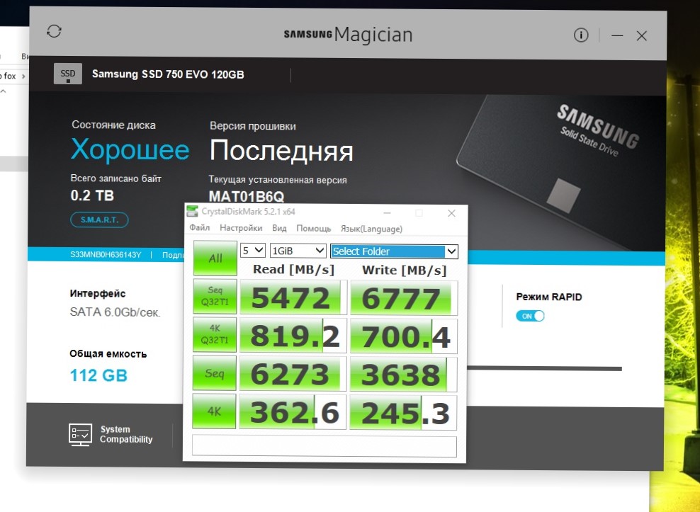 Есть Samsung 850 EVO 500 Gb. Попробовал скопировать большой файл (17 гигов) внутри накопителя. Скриншот прилагаю. Драйвер родной от WIN10. Режим RAPID включен. #77