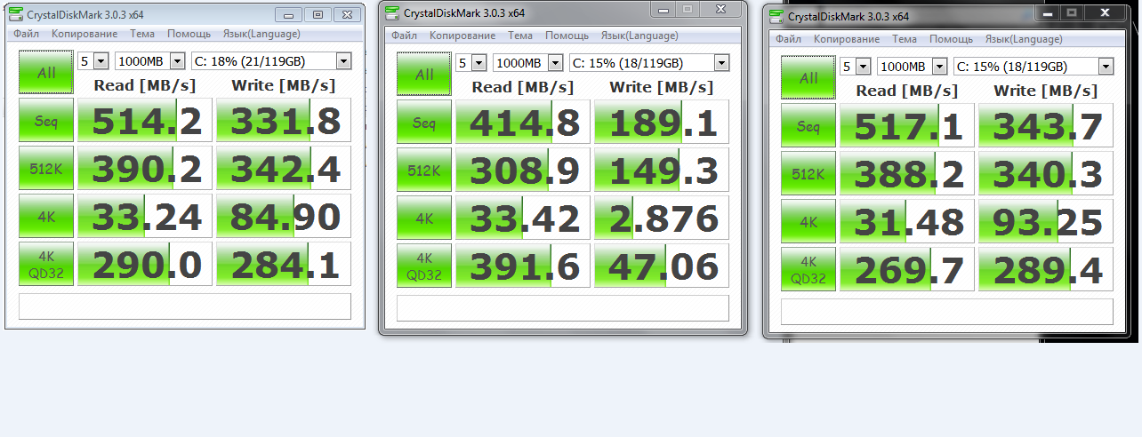 Прошивка 1.06 пару недель работает без единого сбоя. Проблема при установленном Intel® Rapid падает скорость, а без него не пишутся диски. Так и должно быть? Скрины с лева на права -чистая винда без дров -винда с дровами -винда с удаленном Intel® Rapid