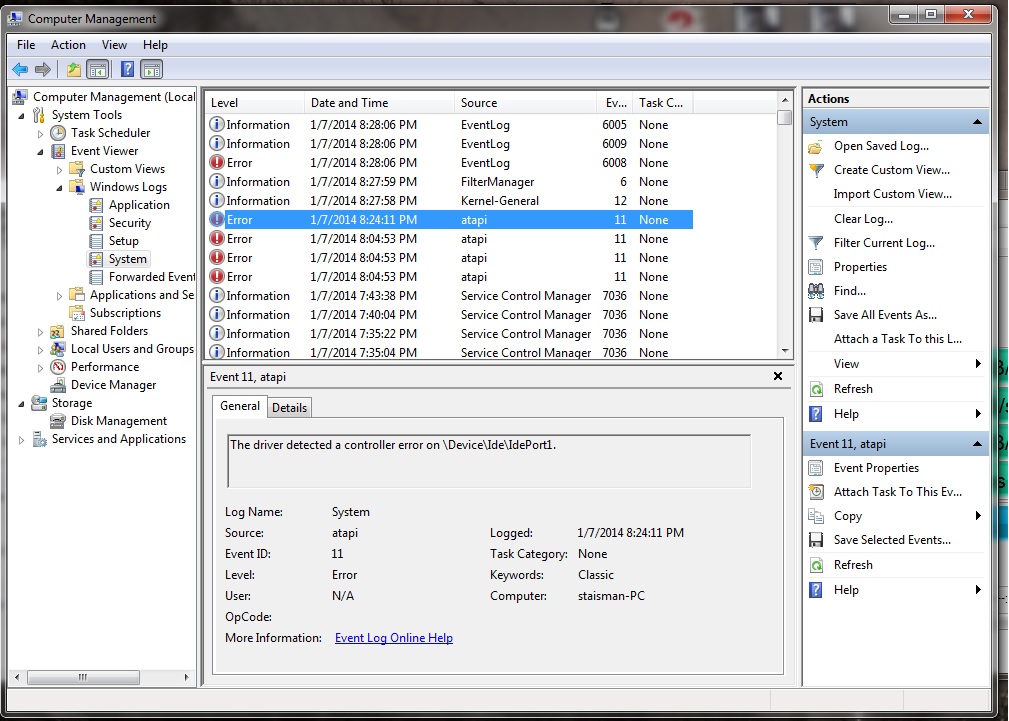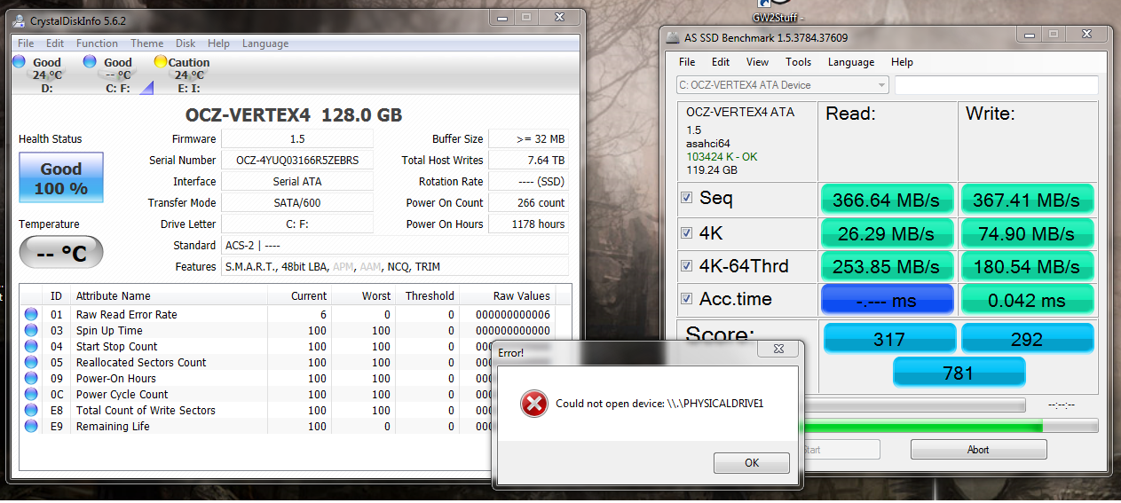 Начались проблемы с системой, комп начал зависать последние два дня. В event viewer нашел ошибку The driver detected a controller error on \Device\Ide\IdePort1. Так же после прогона SS Benchmark в конце выдает ошибку Couldn't open device \.\\PhysicalDrive1 Drive1 как раз мой SSD винт на котором и стоит система.