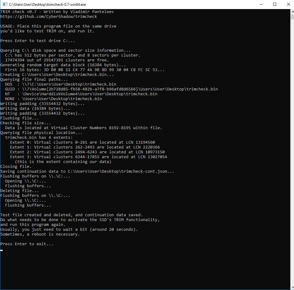 5. Для того чтобы узнать работает ли TRIM воспользуйтесь программой TrimCheck. (Проверить включена ли поддержка TRIM в ОС можно следующим образом: необходимо набрать в командной строке fsutil behavior query DisableDeleteNotify (необходимы права администратора). Если ответ будет 0, то TRIM работает и включен. Если ответ будет 1, то включить TRIM можно командой: fsutil behavior set DisableDeleteNotify 0. По умолчанию в Windows подача этой команды включена.