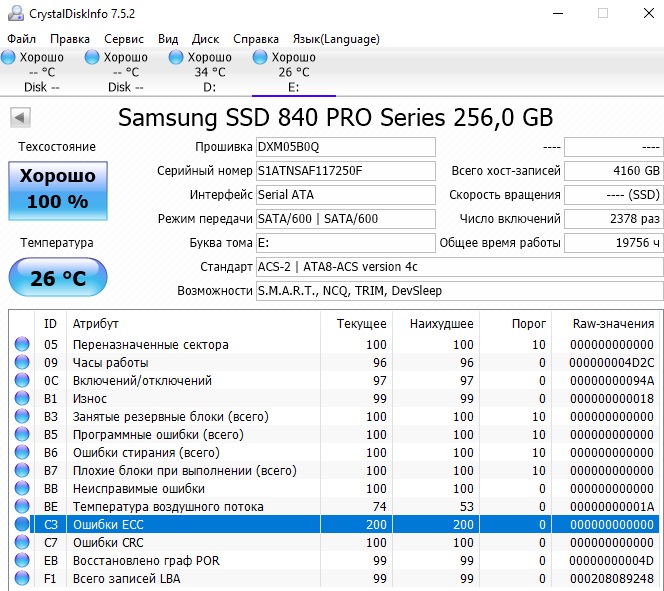 7. Для того что бы оценить состояние диска SSD воспользуйтесь прогнраммой Crystal Disk Info. Перед выкладыванием скриншотов Crystal Disk Info в меню Сервис>Дополнительно>Raw-значения выберите вариант "10 [DEC]" это несколько упростит восприятие информации.