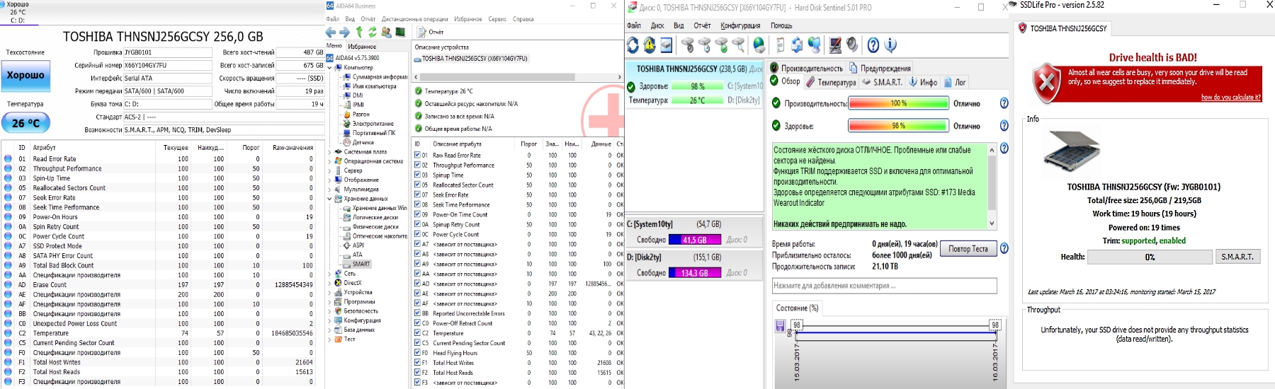 Добавлено спустя 34 минуты 21 секунду: P.S. Плохо и то, что в базах программ-смотрелок его нет. Показывают все разное. Вроде когда всё хорошо и не надо. А продавать надумаешь? Какой-нибудь умник докопается, и не докажешь. Сутки работы, тесты, записи\перезаписи и проч.. 1.CrystalDiskInfo (боле-менее) 674Гб записей, смарт, температура, число вкл., общее время работы, прошивка, серийник 2. AIDA64 нет данных , смарт, температура, прошивка, серийник 3. SSD-Z нет данных , смарт, температура, прошивка, серийник 4. Hard Disk Sentinel Pro21 Терабайт (двадцать один терабайт за сутки) записей (Где он это взял)???, здоровье 98% отлично, смарт, температура, общее время работы, прошивка, серийник 5. SSDlife Pro диску капец, он TOSHIBA THNSNJ256GCSY оказывается вообще мёртвый, здоровье 0%, всё очень BAD , красное.