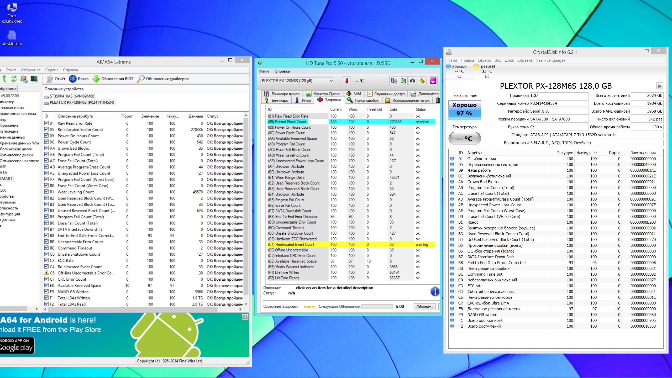 Обновил тут себе прошивку на Plextor M6S 128gb и помоему диск начал подтупливать тут решил посмотреть его смарт и обнаружил Re-allocated Sector Count у меня с немалым значением пожалуйста подскажите какой из программ верить в аиде и hd tune значение не маленькое, в CrystalDiskinfo нулевое значение. Да и если проблемы с 1,07 прошивкой на какую стоит откатить 1,03 или 1,06? До это у меня стояла 1,01 помоему или 1,03 точно не помню. Подскажите а то замечаю система стала как то с зависаниями работать.