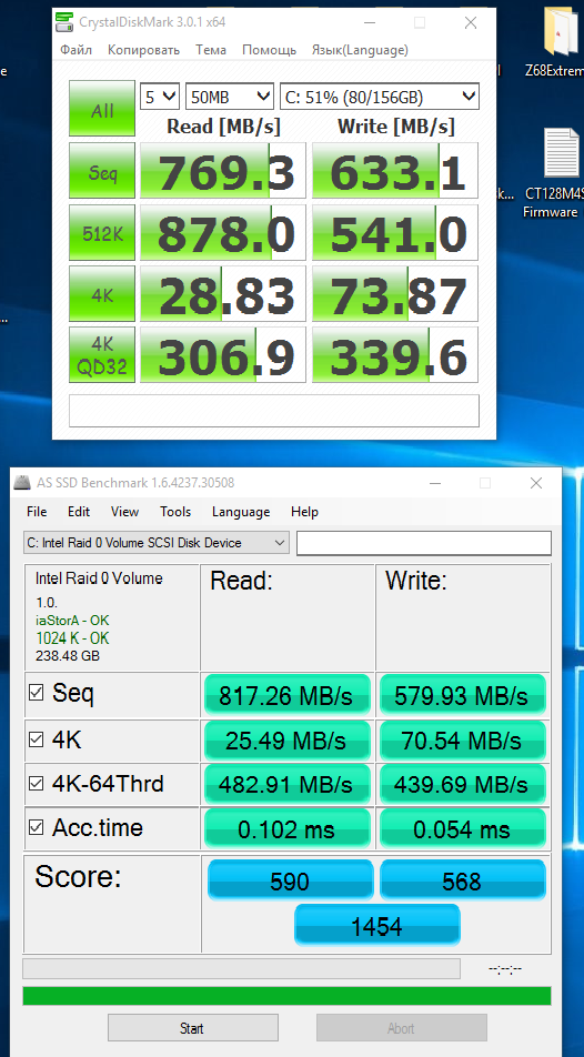 и какой смысл? вы тестируете скорость оперативки, а она вроде не имеет свойства терять скорости. Вообще диск лишь для бенчей и нужен, а в рельности все сильно хуже - при интенсивной нагрузке скорость падает до 30МБ/с даже на линейных скоростях (просто перекидывал крупные файлы с диска на диск), приходится потом некоторое время ждать пока не восстановится производительность, причем это происходило как раз при включенном рапиде. Более слабый в этом плане диск intel SSD S3500 с низкими по нынешним меркам скоростями не теряет своей производительности.