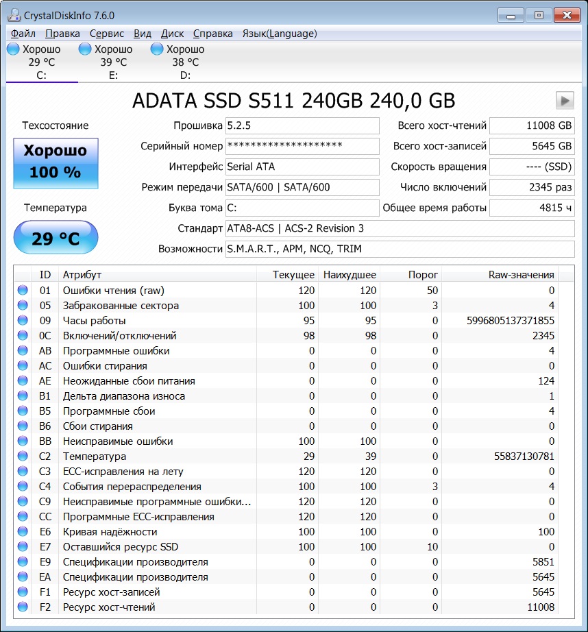 ========================================= Перед публикацией скриншотов Crystal Disk Info в меню "Сервис" >> "Дополнительно" >> "Raw-значения" выберите вариант "10 [DEC]". Это упростит восприятие информации. В меню "Сервис" ставьте галочку "Скрыть серийный номер".