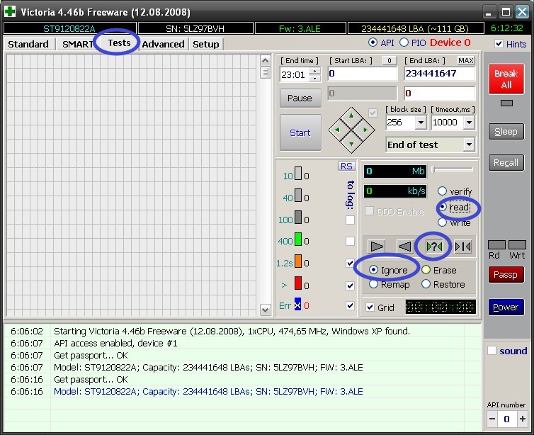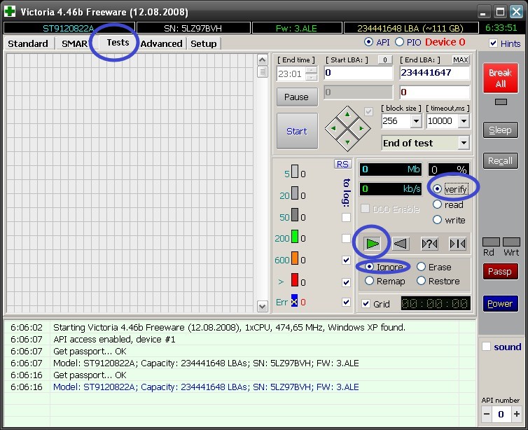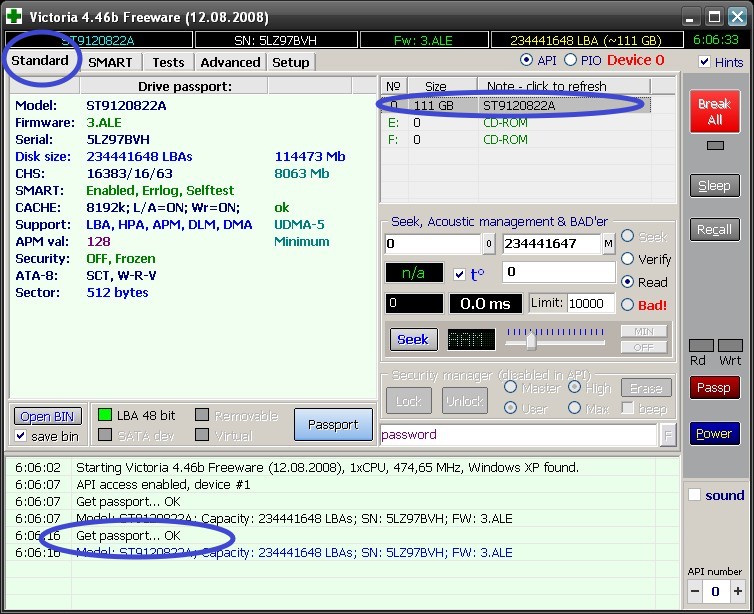 (записываем на диск, в БИОС ставим загрузку с СД, загружаемся, выбираем Mini Windows XP, далее уже на открывшемся рабочем столе выбираем HBCD Menu - HDD ... Programs - Hard Disk [или что-то такое] - там далее в меню есть Victoria). Заходим во вкладку Standart, выбираем, в окне справа, кликом нужный носитель, смотрим, чтобы появилась надпись - Get passport... Ok, а ниже информация о носителе, если не появилось, жмем passport.