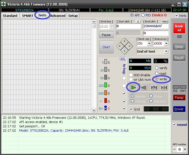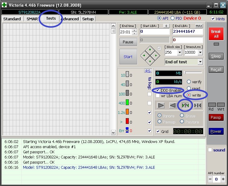 Далее переходим во вкладку Test, ставим галочку: Write, DDD Enable, Random scan и жмем Start и ждем ~ 5 минут, затем нажимаем Stop Внимание: при тестировании в режиме write - информация стирается! Вам говорят, что ВСЕ данные будут уничтожены - соглашаетесь.