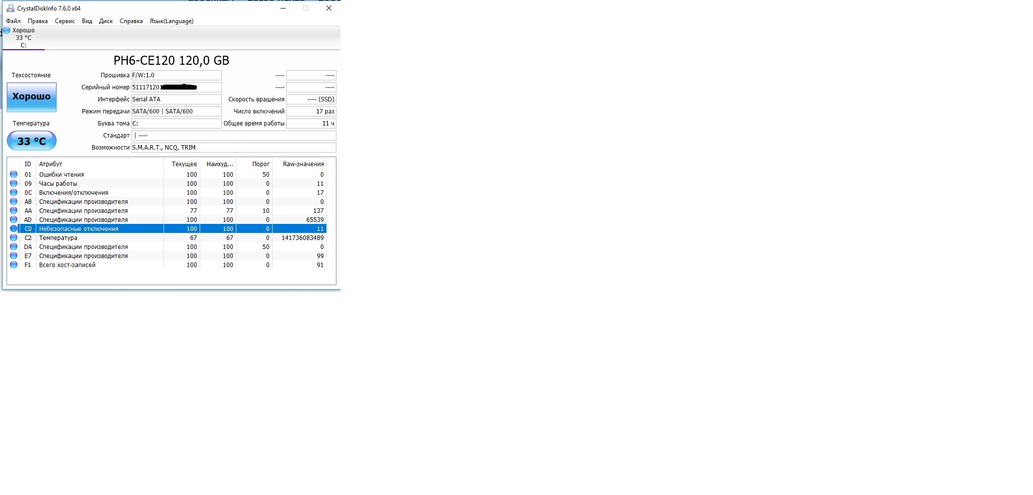 Здравствуйте! Люди знающие подскажите мне. Вчера купил сие чудо PLEXTOR LiteOn MU 3 PH6-CE120-M06 120Гб, установил 10 домашнюю официальная версия. Никакой информации на официальных сайтах нету. Поверил на скорость диск этим CrystalDiskMark6_0_0 скорости почти совпадают с заявленными. Но при проверке слышен писк от диска, хз может так у всех? Т.к. нет родного софта, проверял CrystalDiskInfo7_6_0 этим, нашел информацию об ID. Меня смущает показатель С0 за день уже 11, второй день 13, сбоев не было, ноут(ASUS X550CC) выключался корректно, стоит переживать за этот параметр?