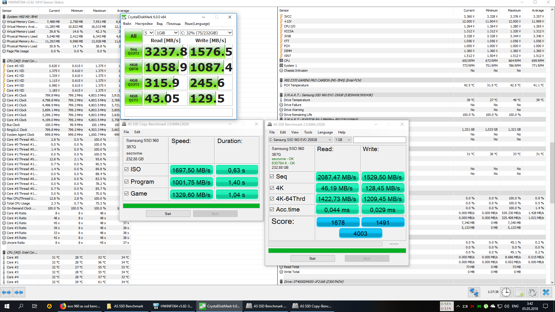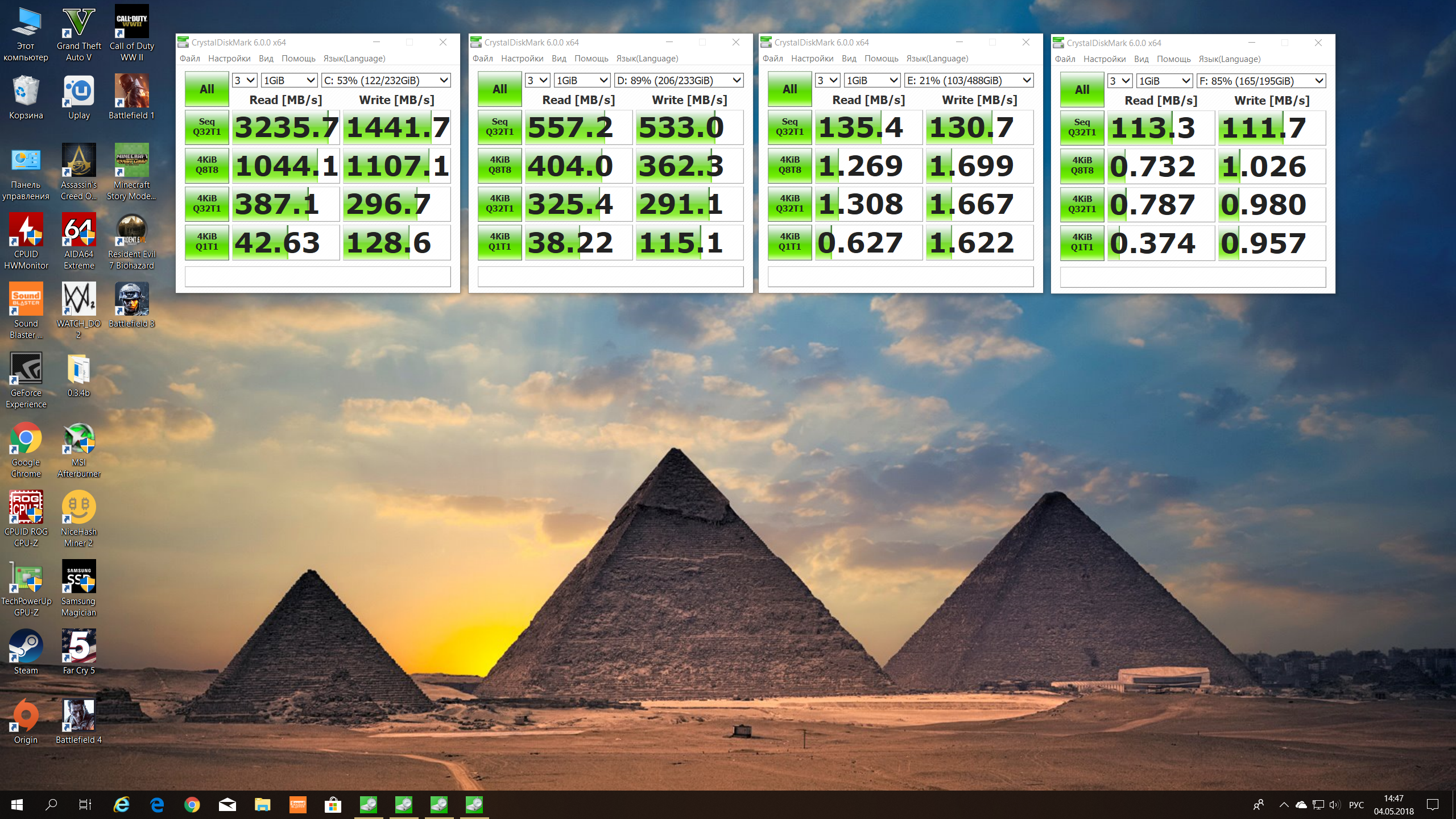 Сделал тест скорости дисковой подсистемы в CrystalDiskMark. Слева направо: 1) 250 ГБ SSD M.2 накопитель Samsung 960 EVO [MZ-V6E250BW] 2) 250 Гб SATA SSD-накопитель Samsung 750 EVO [MZ-750250BW]. 3) 1Тб WDC WD1003FBYX-01Y7B0 (блэк серия) 4) 500Гб WDC WD5000AAKS-00UU3A0 (блу серия)