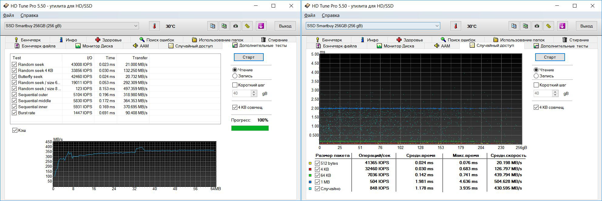 Тест скорости после очистки небольшого объёма (с 97,7% до 91,5) и простоя в течение получаса. Как видим, возрос random write (Q=32, t=1) с 93 до 252 mb/s :