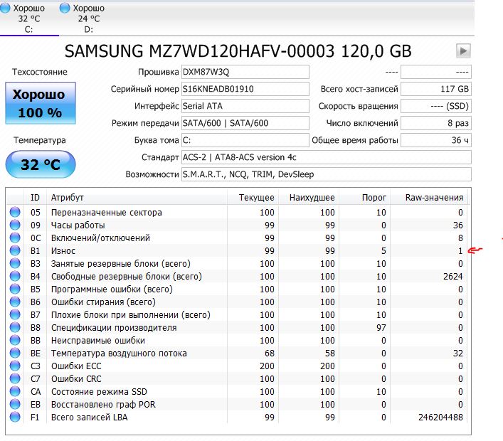 и не очень порадовал параметр B1 (wear level count), чёт быстро, не?