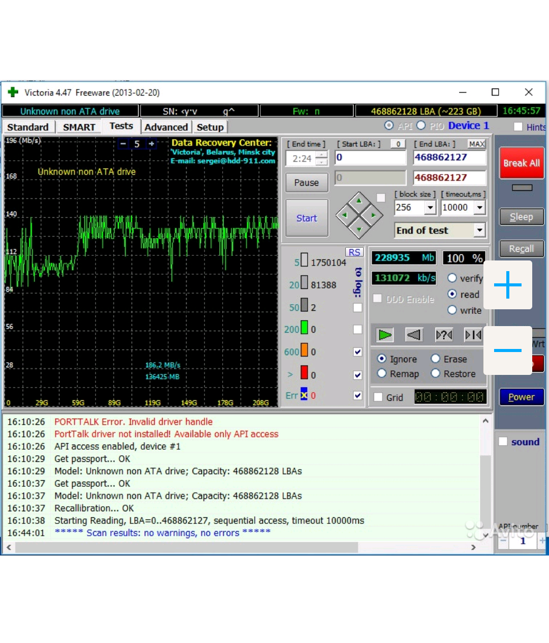 dimka11 похоже, что залочился он. можно повозиться самому с hdat2 (и пытаясь угадать пароль, если это именно блокировка), но imho проще поменять по гарантии. к тому же по смарту видно, что вот так сразу один сбой очистки и три реаллока прямо на новом - я бы возиться не стал, а сразу отнес его обратно.