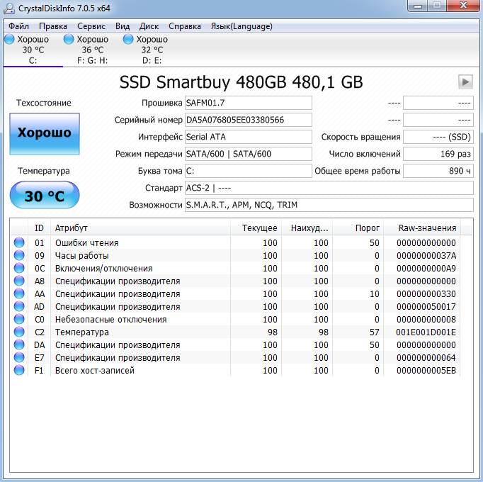 7. Для того что бы оценить состояние диска SSD воспользуйтесь прогнраммой Crystal Disk Info. Перед выкладыванием скриншотов Crystal Disk Info в меню Сервис>Дополнительно>Raw-значения выберите вариант "10 [DEC]" это несколько упростит восприятие информации.
