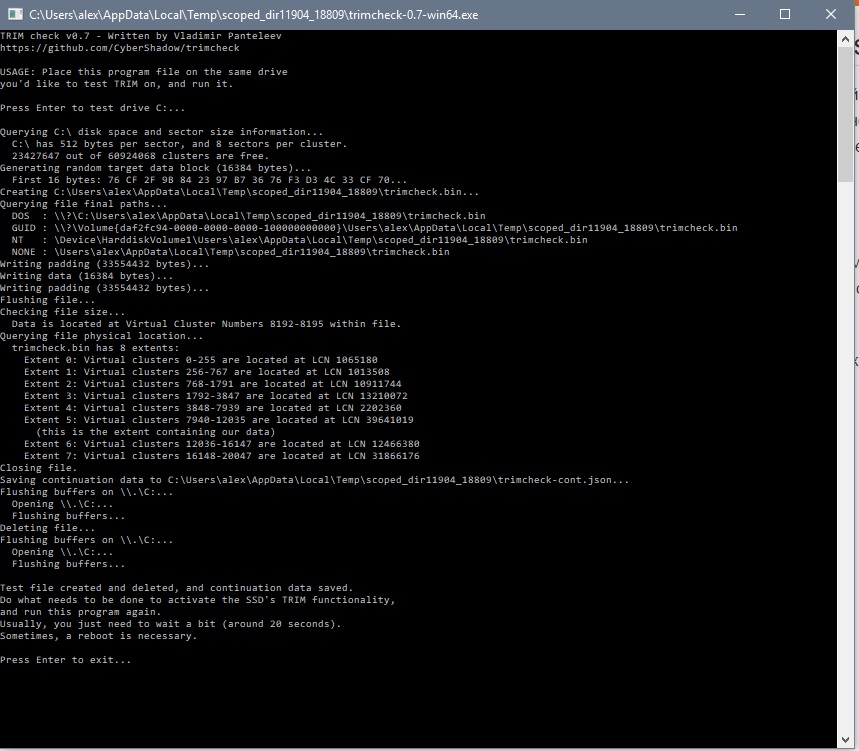5. Для того чтобы узнать работает ли TRIM воспользуйтесь программой TrimCheck. (Проверить включена ли поддержка TRIM в ОС можно следующим образом: необходимо набрать в командной строке fsutil behavior query DisableDeleteNotify (необходимы права администратора). Если ответ будет 0, то TRIM работает и включен. Если ответ будет 1, то включить TRIM можно командой: fsutil behavior set DisableDeleteNotify 0. По умолчанию в Windows подача этой команды включена.