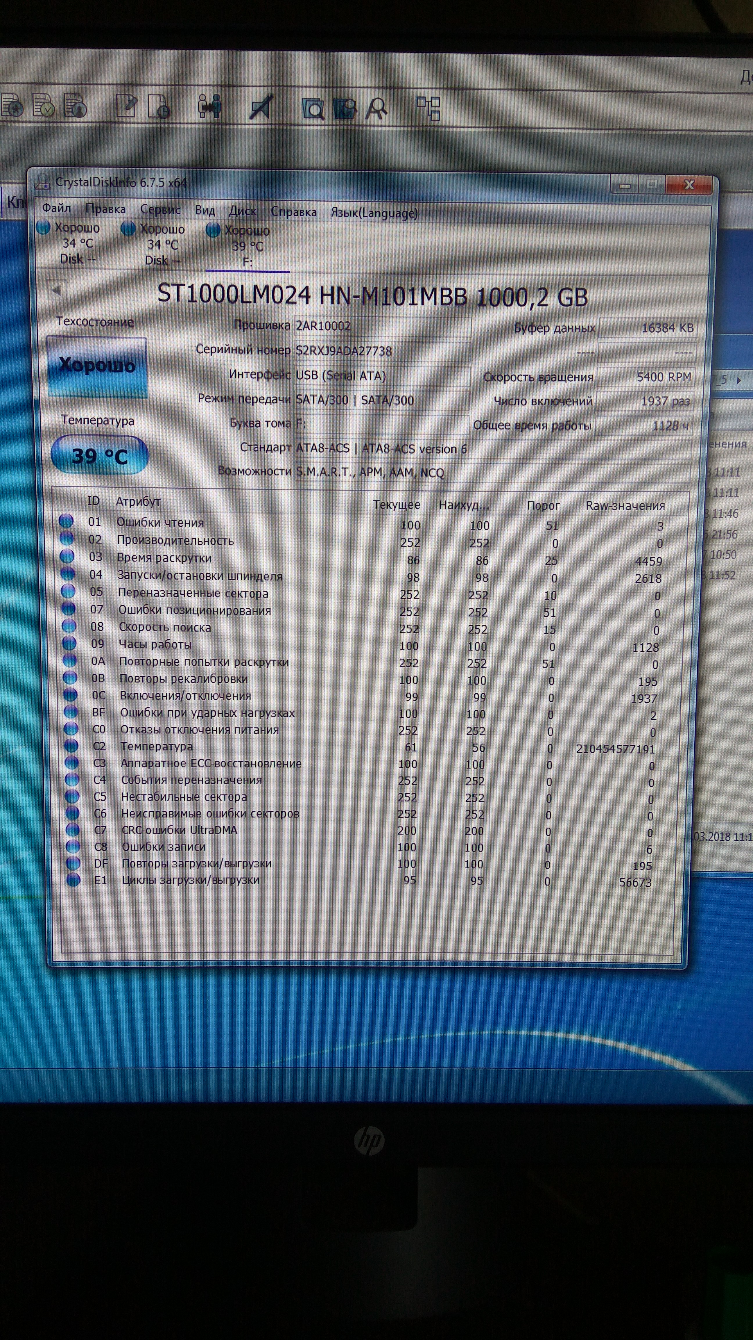 Здравствуйте. Имеется внешний жесткий диск, в котором установлен st10000lm024 hn-m101mbb. Подключен он к роутеру, как сетевое хранилище. При записи данных на диск, периодически раз в 10-15 минут раздаются три не громких щелчка, передача данных на это время(примерно 1-2 сек) останавливается, потом сразу возобновляется. Питания диску хватает, замерял, просадка примерно 10мВ. прилагаю два смарта, с разницей один день. незначительно растет параметр повторы рекалибровки.
