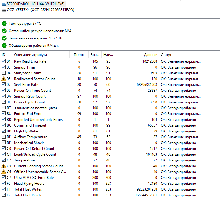 Купил Seagate IronWolf 8Tb ST8000VN0022, смарт при запуске был идеален, скорости тоже (245-235), но без нагрузки гудит как трансформатор, я ожидал, что когда пишут шумный, то имеют в виду именно когда пишет-ищет что-то, а он и в простое гудит сильнее 200мм вентиляторов на Core v71 в Low режиме. Время от времени сам себя постукивает типа, я эти легкие толчки аж на корпусе чувствую. Просто так за 1 час работы набрал G-Sense Error от 0 до 12, вообще нон сенс, у меня такого никогда не было, на реддите люди пишут у них что-то похожее и на дисках более 1000 G-Sense ошибок. У меня мать Asus z370-f strix, так вот винт Hardware ECC Recovered посадил нормализованную величину от 100 до 6 (порог 0), то есть куча Hardware ECC Recovered ошибок, а raw-value этого значения точно такое же как и у Raw Read Error Rate, но у Raw Read Error Rate минимальное нормализованное было 64, что есть норма, а вот чтобы Hardware ECC Recovered проседал в 6 это я без понятия, хотя пишут, что с матерями Асус такое может быть нормой, плохой кабель можно исключить, другие винты нормально от него, плохой контакт - хз, сата всегда на соплях держится, подключен так же как и SSD MX500, у него проблем нет.