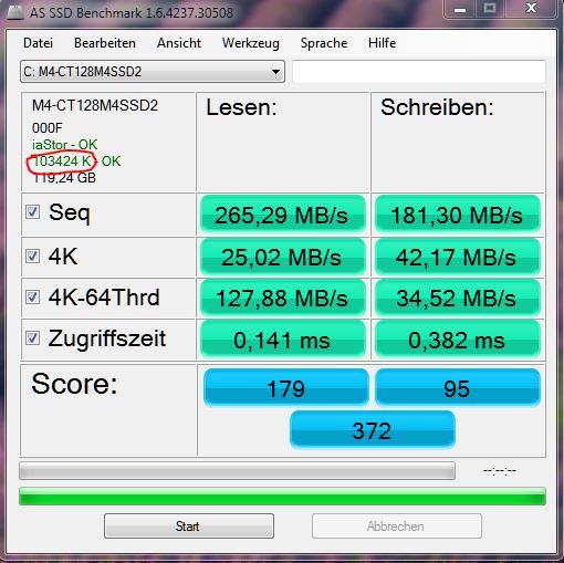 6. Для того чтобы увидеть драйвер под которым работает диск, включен ли AHCI и выровнен ли раздел, следует просто запустить программу: AS SSD Benchmark. #77#77 Если выровнен и включен AHCI, то строка с выравниванием - зеленого цвета и заканчивается ОК. Если нет, то строка красного цвета и заканчивается BAD. Выравнивать с помощью Paragon Alignment Tool (PAT).