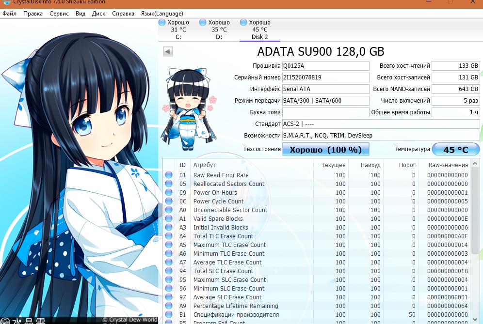 Здравствуйте, приобрел ADATA Ultimate SU900 128GB, почему-то на новом диске уже было хост-чтений 133 GB, хост-записей 131 GB, всего NAND записей 643 GB, включений 5 раз, время работы 1 час, как такое может быть, упаковка была запечатана и по внешнему виду не вскрывалась до меня. И посмотрите еще пожалуйста SMART диска, что то греется 45 градусов и это я еще систему не устанавливал на него, все ли с ним нормально? Так же программа smi_flash_id почему то показывает только модель контроллера, а установленную память нет, почему?