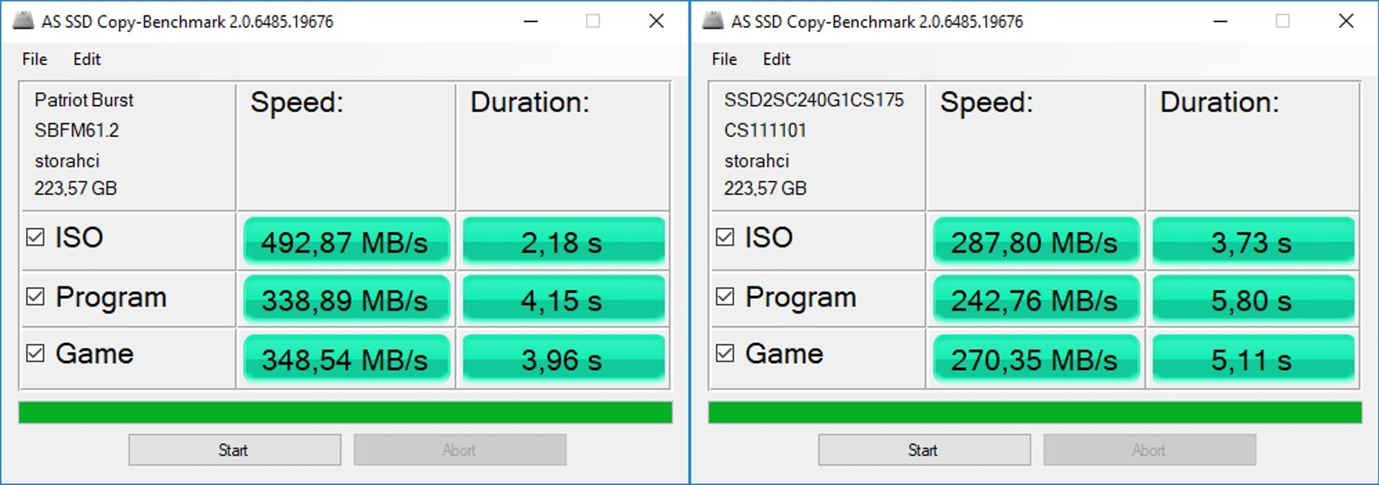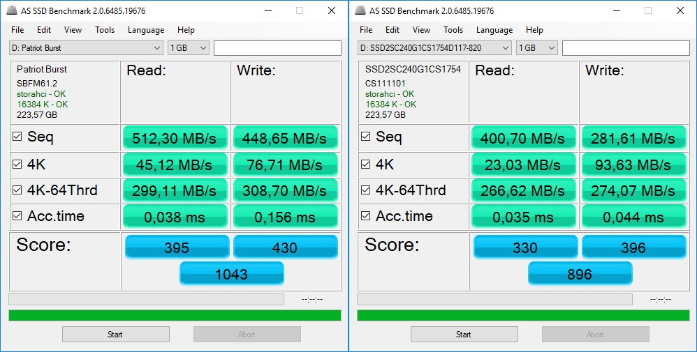 В левом углу ринга - спортсмен в синей майке и чёрных трусах (Patriot Busrt 240GB - Phison S11 + 3D TLC), в правом углу ринга спортсмен в белой майке и голубых трусах (PNY CS111 240GB - SM2246EN + MLC).