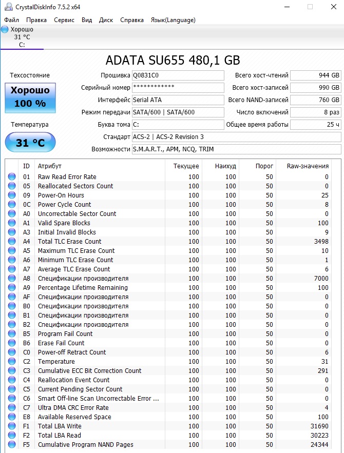 ========================================= Перед публикацией скриншотов Crystal Disk Info в меню "Сервис" >> "Дополнительно" >> "Raw-значения" выберите вариант "10 [DEC]". Это упростит восприятие информации. В меню "Сервис" ставьте галочку "Скрыть серийный номер".