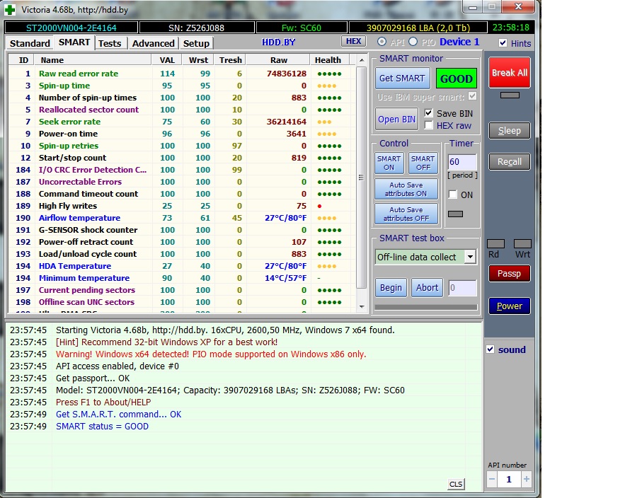 Всем привет , подскажите, может, кто сталкивался с подобным , винчестер Seagate ST2000VN004 , закреплён хорошо, корзина, с анти вибрационными прокладками на болтах, во время работы, по системному блоку никто не пинает и не стучит, от силы , сабвуфер, стоящий рядом, под столом ,может работать какое то время , и создавать вибрации , если они конечно значительны , так вот , суть вопроса в чём, растёт параметр 189 High Fly writes 25 25 0 75 • отвечающий за высокий взлёт головок , при записи, подскажите, стоит ли обращать внимание на этот параметр ? В интернете об этом как то двояко сказано . Дело в том что на винте очень много нужной инфы, забит под два терабайта , почти полностью, с потерей инфы я уже сталкивался , было дело, и тоже на сегейтах , в их самой печальной серии, с "мухой сс", теперь по русски говоря очкую что то =) .