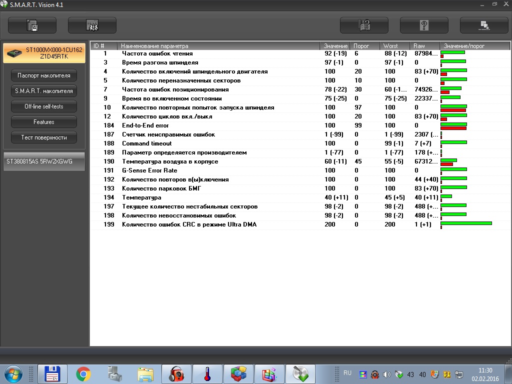 В 2013 году были одновременно куплены два диска Seagate SV35 ST1000VX000 1 Тб (Тайланд). Один дома стоит другой на эфирной машине вещательном сервере. отработали оба по 2 с лишним года. На сервере диск начал исчезать из системы сам по себе. СМАРТ показывает вот что. Спецы сказали, что возможно окислены контакты ввода в гермоблок на плате контроллера диска, либо накрывается голова. Предложили снять прочистить контакты и прогнать посекторно через Викторию. На домашнем диске таких ошибок нет. Серверный диск стоит в системном блоке в контейнере-аппаратной (круглосуточное радиовещание), летом там была жара до 42 град., кондишина пока нету, охлаждал воздух в контейнере с помощью ведер с холодной водой и тряпками в виде фитилей испарителей. Может что-то повлиять и нужно ли покупать новый HDD? Кстати какой лучше и надежнее: SV35 или стандартный DM003? Кто что может посоветовать из бывалых?