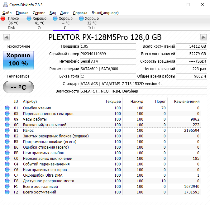 Добрый день! Помогите определить причину непонятной "работы" SSD Plextor M5 PRO 128Gb