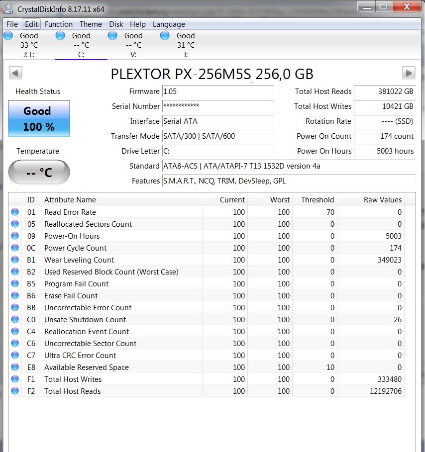 Здравствуйте. Тоже зашёл сюда, т.к. увидел износ на PLEXTOR PX-128M5Pro 128,0 GB. Хотелось, узнать, можно ли посчитать общее количество ячеек памяти на накопителе? И сколько он вообще проживёт до полного износа. На данный момент: Хост-записей: 17334 GB Время работы: 3679 ч Износ: 491510. Диск системный, видимо поэтому 7-ка довольно быстро его "износила"