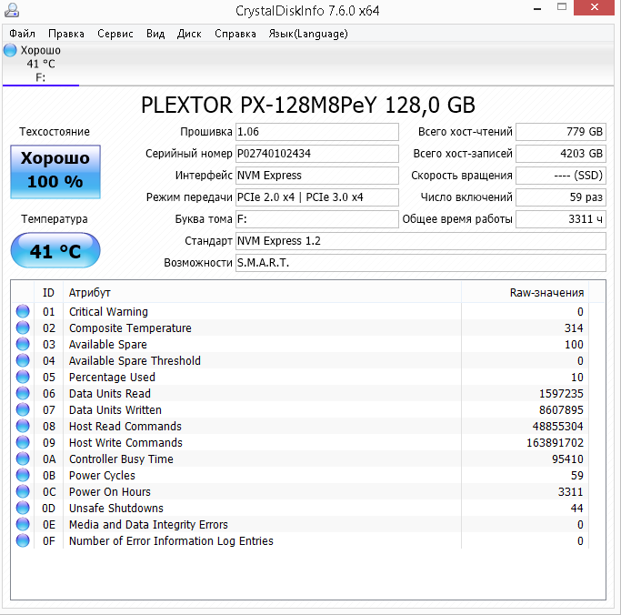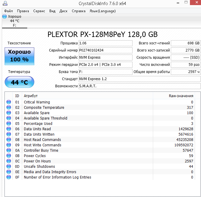========================================= Перед публикацией скриншотов Crystal Disk Info в меню "Сервис" >> "Дополнительно" >> "Raw-значения" выберите вариант "10 [DEC]". Это упростит восприятие информации. В меню "Сервис" ставьте галочку "Скрыть серийный номер".