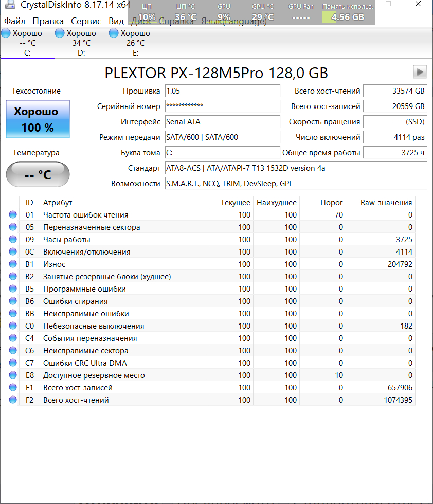 тоже не вериться что всего 3725 ч, и это с февраля 2014г. ежедневно работает по 12-14ч/сутки. а получается считает по 1-у часу в день. я на это не смотрю. есть параметр В1 износ. считается просто B1*(умножить) на объем диска и разделить на 1024 = кол-во перезаписей(NAND-записей). пример (В1 вашего) 421 766*128/1024=52 720.75 ваш M5Pro еще ого-го! "любители всего нового" скажут - он же медленный, маленький по объему, с SATA это уже анахронизм.. зачем всё это? когда есть M2 NVMe на 1-2TB со скорость в 5-10 быстрее. и будут правы. но как чисто системный вполне хватает и объема, и скорости. под систему бОльшего объема не требуется, у меня ни когда не был занят более чем на 50%, за исключением эксперимента когда поделил на 68GB под Win 10, и на 50GB под Win 7 (ну не куда было поставить 10-ку, а попробовать хотелось, и 7-ку рушить не хотелось)