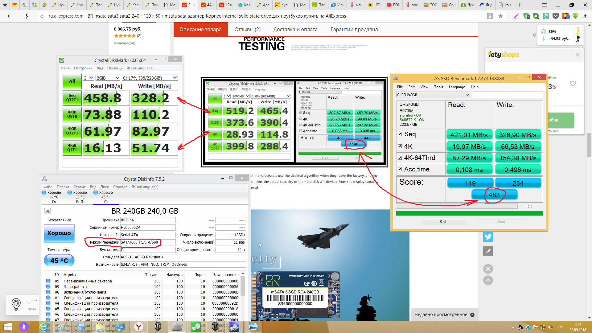 Уважаемые форумчане, заранее приношу свои извинения, если влез не в ту тему. Компьютерная грамотность у меня ниже плинтуса. Суть вопроса в следующем. Купил на Али SSD, а показания скорости не соответствуют картинке из описания товара. В центре показания из описания товара. Справа и слева то, что получилось у меня. На чистом диске, ещё до загрузки на него системы, было так же. Диск вставляется в материнку в собственное гнездо без переходников. Я понимаю, когда результирующая цифра отличается на 100-200 единиц, но когда более чем в два раза (1140 против 483), возникают сомнения в качестве или соответствии товара к описанию. Стоит открывать спор с продавцом или я заведомо его проиграю. Ссылка на товар https://ru.aliexpress.com/item/BR-msata ... 2dd5a6c8f6