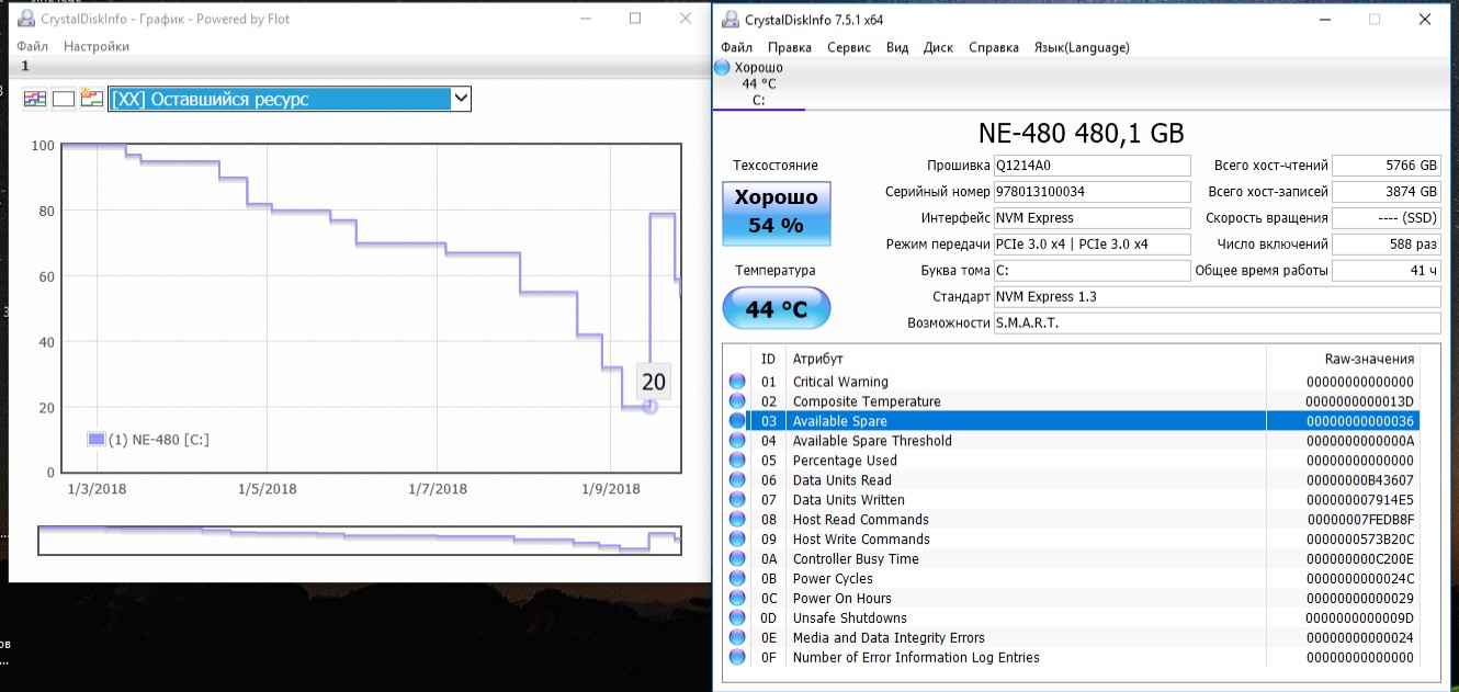 Поставил клиент игры с нуля, ставилось фоном во время игры в тотал вар, без ошибок/вылетов/зависаний. Правда запускать не пробовал😅. available spare не рос, только уменьшается, щас 36. Рост ресурса есть только на графике, в смарте как было 0 израсходовано так и держится.