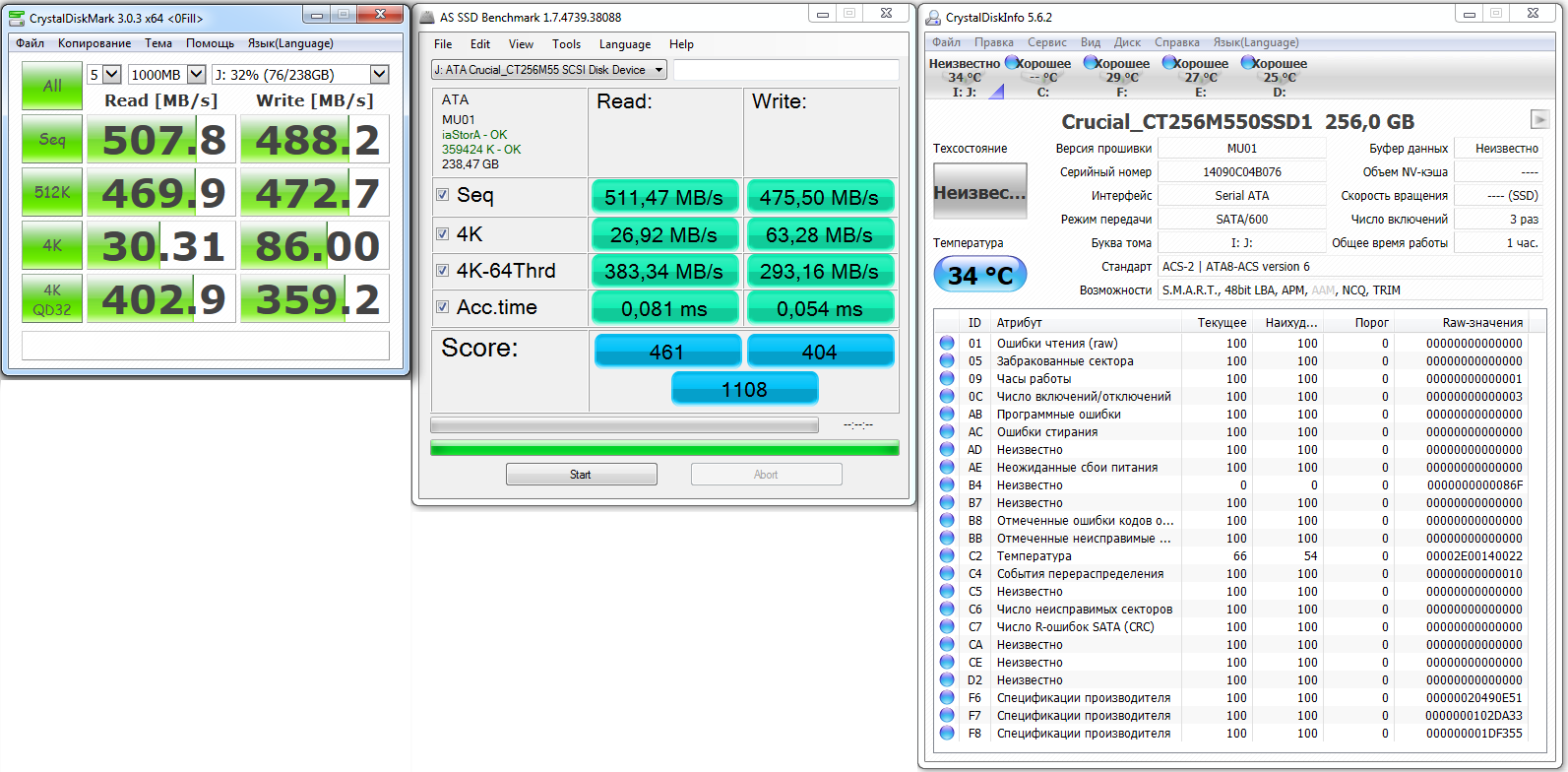 Тесты Crucial M550 256Гб. Тестил с другого ссд, на котором установлена вин7х64. Драйвер intel IRST, версию не помню подскажите где глянуть? Проц Xeon 1230v2 (аналог i7-3770 но без встроенного видео), материнка Асус z77-V pro. Ссд подключен к сата 6, сдвоенным кабелем как на рисунке http://www.ngohq.com/images/sata6gb.jpg