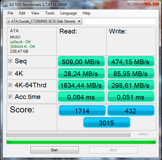 Дополнение к тесту Crucial M550 на предыдущей странице. Прогнал тесты в режиме макс. производительности - практически нет отличий от сбалансированной, в AS SSD даже совпало кол-во баллов (1108) . Потом попробовал нагрузить проц, ничего более умного как врубить ОССТ перед тестом в голову не пришло, тут результаты уже больше отличаются. А кол-во попугаев вообще запредельное