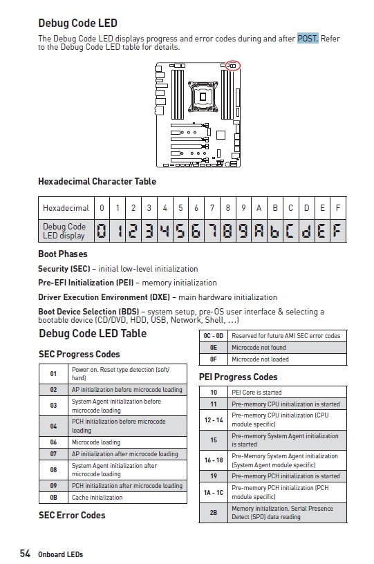 У меня в табличке POST code для UEFI BIOS написано так 01h. Начало работы BSP 02h. Начало работы MCFG 03h. Начало работы RCRB 04h. Контроль состояния BSP 05h. Задание Ratio 06h. Начало работы HP 07h. Происходит записывание uCode 08h. Проверка BIST 09h. Начало работы MTRR 0Ah. Инициализация стека 0Bh. Старт работы PEI D0h. Сбой в памяти устройства D1h. Сбой при выполнении конфигурации