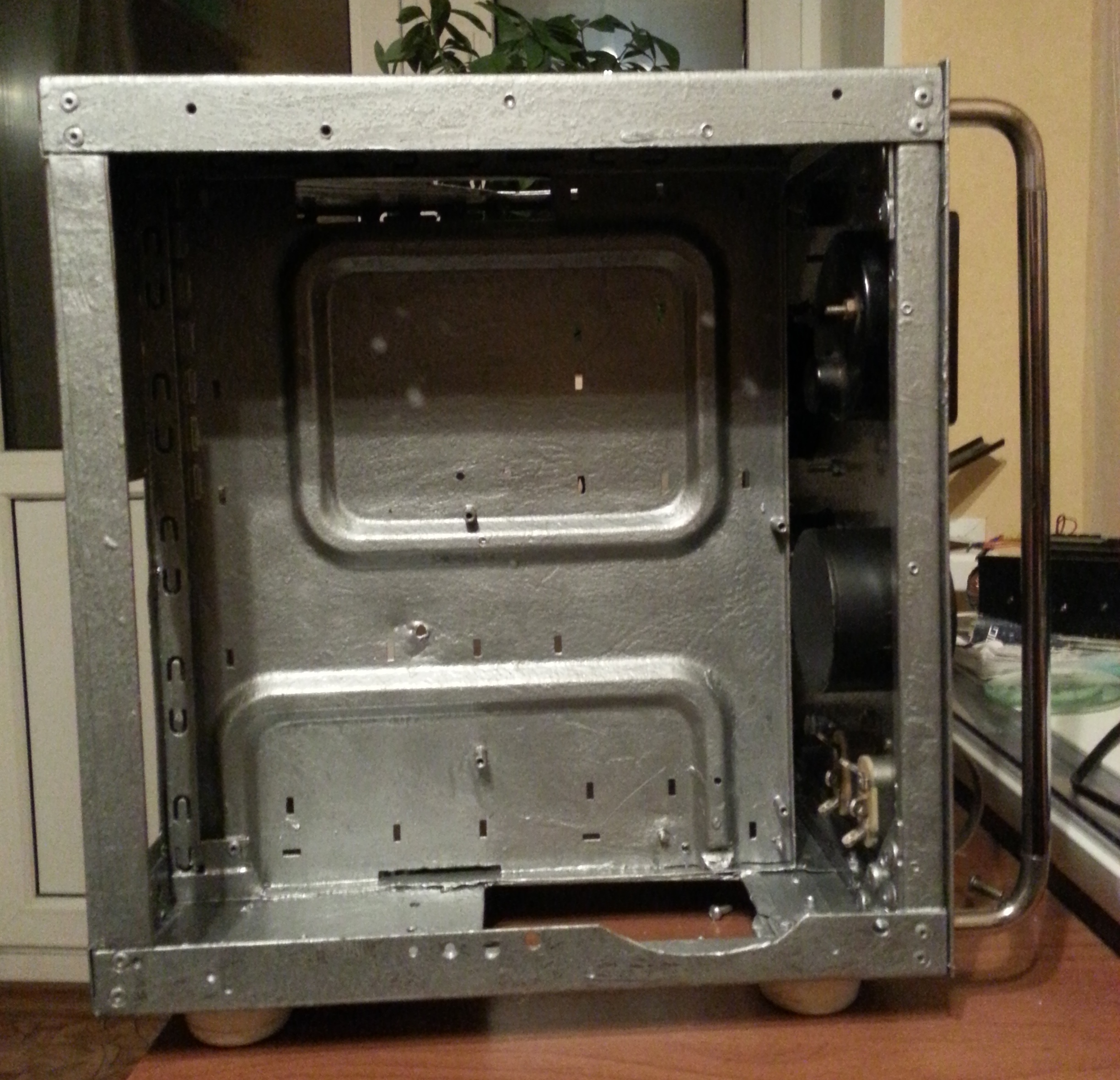 Ручка - да, потому что таскать и потому что тяжелый, корпус - часть всамделишного "Блока управления и сигнализации БУС - 6" из стали 0.6 - 0.8 мм, приблизительно. Видео встроенное в Biostar A880G+, проц - AMD Athlon II X4 630 2.8 GHz, две планки по два гига DDR3 ну и, пока что, Windows 10 Technical Preview 64.