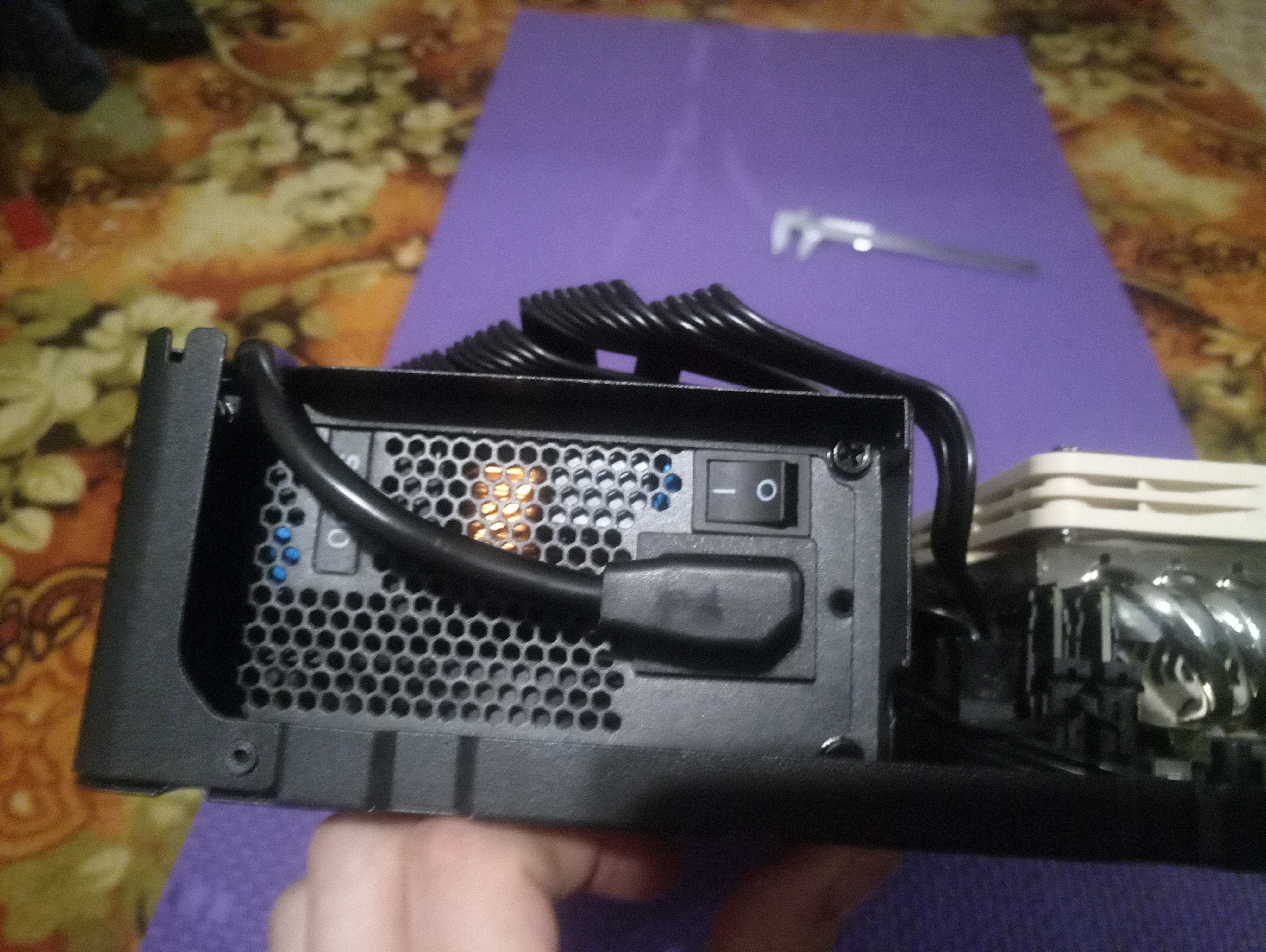 Добавлено спустя 6 минут 15 секунд: Первая Установка видеокарты. несмотря на то, что по характеристикам в корпус влезают карточки до 50мм толщиной, Пульс не поместился в держатель слота, так что пришлось дорабатывать его и корпус напильником: немного разогнуть скобу держателя, и отгонуть обратную чать на корпусе. А кроме того - срезать одно из креплений.